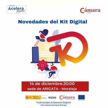 La Oficina #AceleraPyme, de la La Cámara De Comercio Cáceres, organiza una jornada informativa sobre Novedades del #KitDigital, el día 14 de diciembre, lunes, a las 20:00 h en el la sede a Asoc Empresarios Rivera de Gata -ARIGATA (Ronda de los Molinos, 4-. Moraleja) , en la Cámara Agraria, Su objetivo es informar a la todos los #empresarios y #autónomos de la zona en qué consiste el kit digital y cómo les puede beneficiar para poder conseguir más clientes en sus negocios, como poder digitalizar la gestión de clientes de la empresa y como incorporar #ciberseguridad o la #facturación electrónica. Para poder asistir debe inscribirse on line en el siguiente enlace: https://us06web.zoom.us/.../tZIoduuopjosGdc4Nkt8kGep9DT8N..