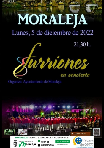 Concierto de Furriones en MoralejaLunes 5 de diciembre Horario: 21:30 horas.Lugar: Centro de Emergencias y Exposiciones “Nave del Trigo” Avda Lusitania, 101 El Ayuntamiento de Moraleja y la Asoc Empresarios Rivera de Gata queremos dar las gracias con este concierto a todas las personas que nos visitarán y consumirán en nuestros establecimientos en estos días.#GraciasporvenirTejido Empresarial Ayuntamiento de Moraleja#AyuntamientoDeMoraleja