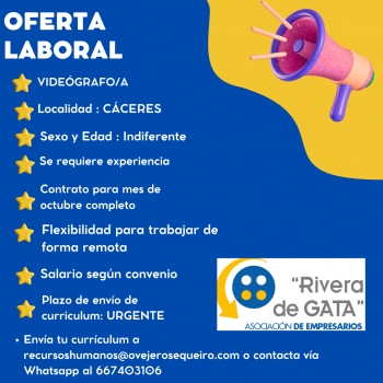 Desde la Asoc Empresarios Rivera de Gata publicamos esta oferta de empleo URGENTE de Videógrafo/a en Cáceres.