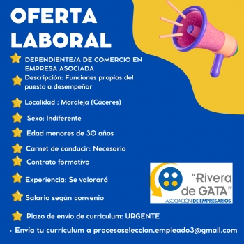 Desde la Asoc Empresarios Rivera de Gata publicamos esta oferta de empleo URGENTE de Dependiente/a de Comercio en Empresa Asociada en Moraleja (Cáceres).