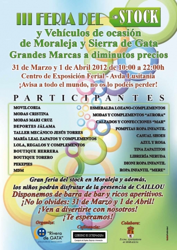 La Asociación de Empresarios Rivera de Gata de Moraleja y comarca celebrará la tercera edición de la Feria del Stock los días 31 de marzo y 1 de abril en el centro de exposiciones municipal, situado en la avenida de Lusitania, en horario de 10 a 22 horas.