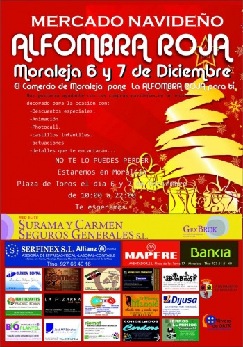 EL COMERCIO DE MORALEJA PONE LA ALFOMBRA ROJA PARA TI-MERCADO NAVIDEÑO, DÍAS 6 Y 7, EN HORARIO ININTERRUMPIDO DE 10 DE LA MAÑANA A 10 DE LA NOCHE , EN PLAZA DE TOROS DE MORALEJA. NO TE LO PUEDES PERDER.