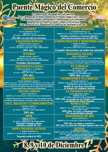 PUENTE MÁGICO DEL COMERCIO. EL COMERCIO DE MORALEJA ABRE SUS PUERTAS.VEN Y DISFRUTA DE LA MEJOR COMPRA EN EL PUENTE MÁGICO DEL COMERCIO.ENCONTRARÁS GRANDES DESCUENTOS Y PROMOCIONES.TE ESPERAMOS. APUESTA POR EL COMERCIO LOCAL.COMPRA CON CORAZÓN.DIAS 8,9 Y 10-EL COMERCIO DE MORALEJA TE DA MÁS!!
