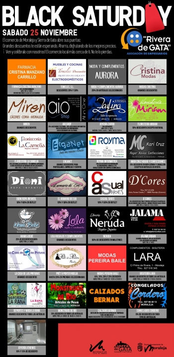 BLACK SATURDAY , SÁBADO , DÍA 25 DE NOVIEMBRE, EL COMERCIO DE MORALEJA Y SIERRA DE GATA ABRE SUS PUERTAS: GRANDES DESCUENTOS TE ESTÁN ESPERANDO .AHORRA , DISFRUTANDO DE LOS MEJORES PRECIOS.¡VEN Y CELÉBRALO CON NOSOTROS!