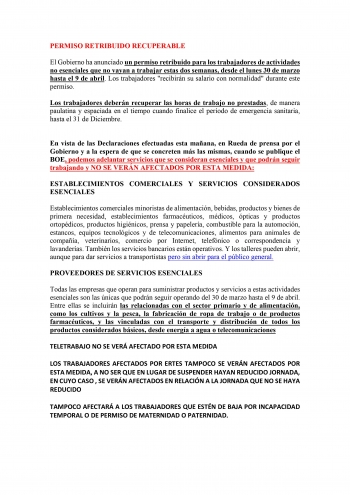 En vista de las Declaraciones efectuadas esta mañana, en Rueda de prensa por el Gobierno y a la espera de que se concreten más las mismas, cuando se publique el BOE, podemos adelantar servicios que se consideran esenciales y que podrán seguir trabajando y NO SE VERÁN AFECTADOS POR ESTA MEDIDA: