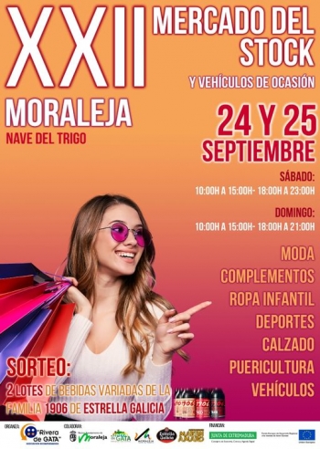 VUELVE EL XXII MERCADO DE STOCKS, LOS DÍAS 24 Y 25 DE SEPTIEMBRE, EN CENTRO DE EXPOSICIÓN FERIAL "NAVE DEL TRIGO" , EN MORALEJA.SORTEO DE 2 LOTES DE CERVEZAS DE LA FAMILIA 1906 DE ESTRELLA GALICIA A CLIENTES DEL MERCADO.VEN Y DISFRUTA DE LOS MEJORES PRECIOS Y DE LA MEJOR CALIDAD. NO TE LO PIERDAS !!#asociaciondeempresariosriveradegata#elcomerciolocalsiemprecercadeti#mercadostocks