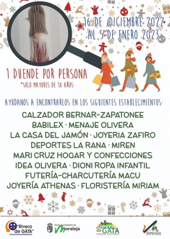 El duende mágico vuelve a esconderse en los escaparates de las empresas de la localidad Las personas que los encuentren obtendrán un detalle por parte de las empresas participantes por ayudarles a dar con ellosLos duendes pueden esconderse en los escaparates de las tiendas anunciadas en el cartel El plazo para encontrarlos es del 16 de Diciembre al 5 de enero . Las empresas locales os lo agradecerán Ayuntamiento Moraleja - CáceresAsoc Empresarios Rivera de Gata