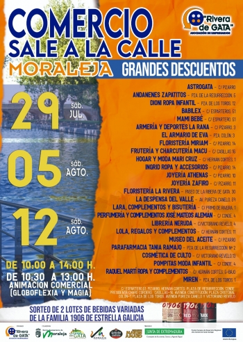 Sábados, 29 de julio 5 y 12 de agosto, de 10 a 14 horas, el Comercio Sale a la Calle en Moraleja.Ven a disfrutar de grandes descuentos, actividades de animación comercial y sorteos Te esperamos, no te lo pierdas!!