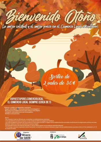 CAMPAÑA BIENVENIDO OTOÑO "LA MEJOR CALIDAD Y EL MEJOR PRECIO EN EL COMERCIO LOCAL ENCONTRARÁS"La Asoc Empresarios Rivera de Gata , sortea dos vales valorados en 30€ cada uno para ser consumidos en establecimientos asociados. Se deberán cumplir los siguientes requisitos.Seguir esta página: Asoc Empresarios Rivera de GataMe gusta en esta publicaciónCompartir esta publicación de forma públicaNombrar a una persona.Los ganadores se darán a conocer el 4 de octubre de 2023 en esta página.Los vales se deberán consumir del 5 al 10 de octubre en alguno de los establecimientos asociados a la Asoc Empresarios Rivera de GataPara recoger el premio el ganador/a deberá presentar un ticket de una compra realizada en alguno de los establecimientos asociados entre el 27 de septiembre y el 10 de octubre.Las bases están expuestas en el propio cartel.colabora : Ayuntamiento Moraleja - Cáceres#BienvenidoOtoño #asociaciondeempresariosriveradegata#consumelocalAsoc Empresarios Rivera de Gata Ayuntamiento Moraleja - Cáceres Tejido Empresarial Ayuntamiento de Moraleja