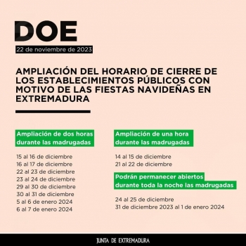 Publicada la autorización para la ampliación de horario de cierre de los establecimientos públicos en Extremadura durante las fiestas de Navidad, Año Nuevo y Día de Reyes.Esta ampliación beneficiará al interior de todos los locales, pero no a las terrazas, que seguirán operando en el mismo régimen horario del resto del año debido a las peculiaridades de su régimen específico. Toda la información | https://www.juntaex.es/w/ampliacion-horario-cierre-navidad#Extremadura #Navidad #horarios Asoc Empresarios Rivera de Gata