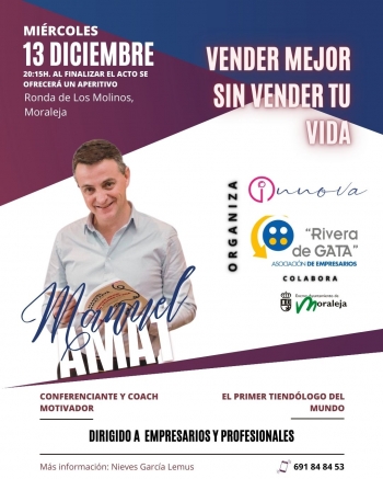 Asoc Empresarios Rivera de Gata (Arigata), en colaboración con la consultora Innova, se enorgullece de presentar una charla gratuita impartida por Manuel Amat Payá reconocido como el primer #tiendólogo del mundo. El evento, titulado "Vender Mejor sin Vender Tu Vida", se llevará a cabo el 13 de diciembre a las 20.15 horas , en Moraleja , en la sede de la Asociación de Empresarios Rivera de Gata y está dirigido a empresarios y profesionales de Moraleja y su comarca.Manuel Amat Payá compartirá estrategias y consejos prácticos basados en su amplia experiencia en el sector de ventas y comercio. La charla se enfocará en cómo los profesionales pueden mejorar sus habilidades de venta y negociación, manteniendo al mismo tiempo un equilibrio saludable entre su vida laboral y personal.Esta es una oportunidad excepcional para aprender de uno de los líderes más influyentes en el campo de las ventas, así como para interactuar y establecer contactos con otros profesionales del área. Tras la charla, los asistentes podrán disfrutar de un #aperitivo, proporcionando un ambiente ideal para el #networking y la discusión de ideas.La participación en este evento es completamente #GRATUITA, pero debido a la capacidad limitada del recinto, se requiere inscripción previa. Los interesados en asistir pueden inscribirse contactando a Asoc Empresarios Rivera de Gata (Arigata) , en el 628825955// info@arigata.es o Innova (( 691 848453) Este evento promete ser una #experiencia enriquecedora, ofreciendo a los asistentes conocimientos valiosos y la oportunidad de ampliar su red de contactos profesionales en un entorno agradable y constructivo.Inscripciones: Asoc Empresarios Rivera de Gata ( 927147388// info@arigata.es) ; Innova ( 691 848453) #comerciodeproximidad #empresas #formacionempresarial #Coaching #manuelamatpayá #AsociacionismoEmpresarial Asoc Empresarios Rivera de Gata Innova Tejido Empresarial Ayuntamiento de Moraleja Ayuntamiento Moraleja - Cáceres