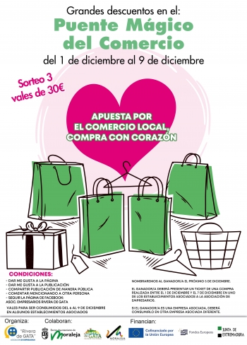 SORTEO FACEBOOK PUENTE MÁGICO DEL COMERCIOSORTEO DE 3 VALES DE 30€ DEL 1 DE DICIEMBRE AL 5 DE DICIEMBRE, PARA SER CONSUMIDOS EN EL PUENTE MÁGICO DEL COMERCIO DEL 6 AL 9 DE DICIEMBRE, AMBOS INCLUSIVE EN ESTABLECIMIENTOS PERTENECIENTES A LA ASOCIACIÓN DE EMPRESARIOS RIVERA DE GATAGRANDES DESCUENTOS DURANTE EL PUENTE MÁGICO DEL COMERCIOLa Asociación de Empresarios Rivera de Gata, de Moraleja y Comarca de Sierra de Gata ,SORTEA 3 VALES DE 30€, para ser consumidos en establecimientos asociados.Tan sólo debes cumplir los siguientes requisitos:Me Gusta en esta página de la Asociación de Empresarios Rivera de Gata Me Gusta en esta publicaciónComparte esta publicación, de forma pública Comenta la publicación, nombrando a otra personaNombraremos a ganadores el próximo 5 de DiciembreCuando retire el VALE, el ganador/a deberá presentar un ticket de una compra realizada entre el 1 al 7 de Diciembre en uno de los establecimientos asociados a la Asociación de EmpresariosEl ganador/a deberá consumir el vale del 6 al 9 de Diciembre, durante la celebración del puente Mágico del Comercio en alguno de los establecimientos asociados.Si el ganador/a es una empresa asociada , deberá consumirla en otra empresa asociada diferente.Las bases están expuestas en el propio cartel .Campaña organizada por Asoc Empresarios Rivera de Gata, con la financiación de fondos europeos , Consejería de Economía, Empleo y Transformación Digital y con la colaboración del Ayuntamiento Moraleja - CáceresSUERTE A TODOS!!! APUESTA POR EL COMERCIO LOCAL , COMPRA CON CORAZÓN !!#asociaciondeempresariosriveradegata #JuntosSumamos #empresas #Moraleja #sierradegata Ayuntamiento Moraleja - Cáceres Tejido Empresarial Ayuntamiento de Moraleja Ayuntamiento Moraleja - Cáceres