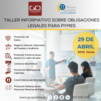 ASOCIACIÓN DE EMPRESARIOS RIVERA DE GATA INFORMA: El próximo día 29 de abril , a las 20.15 ,en el Circular Fab De Moraleja organizaremos desde nuestra Asociación, junto con Grupo Data , empresa con la que tenemos suscrito un convenio de colaboración, un TALLER INFORMATIVO SOBRE OBLIGACIONES LEGALES que tienen las empresas en las siguientes materias : protocolo canal interno de información , el acoso sexual y/o razón de sexo, protección de datos, comercio electrónico, prevención blanqueo de capitales, registro salarial, protocolo defensa de personas menores de edad.