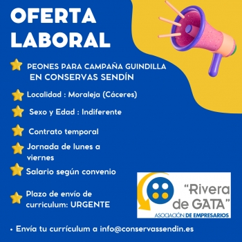 Desde la Asoc Empresarios Rivera de Gata, publicamos esta oferta de empleo URGENTE como PEONES EN CAMPAÑA DE GUINDILLAS EN CONSERVAS SENDÍN, en Moraleja (Cáceres).