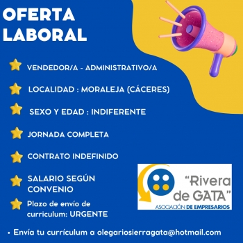 Desde la Asoc Empresarios Rivera de Gata publicamos esta oferta de empleo URGENTE de Vendedor/a - Administrativo/a en Moraleja (Cáceres).