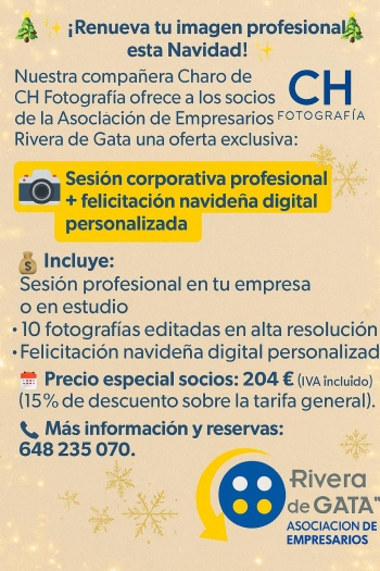 ¡Renueva tu imagen profesional esta Navidad! Nuestra compañera Charo de @CH Fotografía ( Charo Gonzalez Mendez) ofrece a los socios de la Asoc Empresarios Rivera de Gata una oferta exclusiva: Sesión corporativa profesional + felicitación navideña digital personalizadaIncluye: Sesión profesional en tu empresa o en estudio 10 fotografías editadas en alta resolución Felicitación navideña digital personalizada Precio especial socios: 204 € (IVA incluido) 15% de descuento sobre la tarifa general Más información y reservas: 648 235 070 ¡Aprovecha esta oportunidad para actualizar tu imagen y felicitar las fiestas con estilo profesional!* Oferta hasta el 30 de noviembre de 2025#RiveraDeGata #Empresarios #FotografíaProfesional #Navidad2025 #CHFotografía #ImagenCorporativa #OfertaNavideña #AsociaciónEmpresarial Femaerca #asociacionempresariosriveradegata #JuntosSumamos