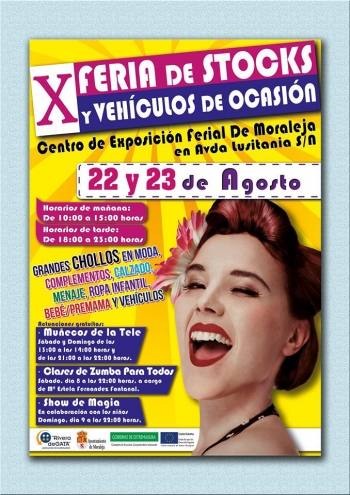 GRANDES CHOLLOS EN MODA, CALZADO, MENAJE, VEHÍCULOS, ARTÍCULOS DE EQUITACIÓN,ROPA INFANTIL, COMPLEMENTOS Y BEBÉ/ PREMAMÁ .LOS ENCONTRARÁS EN LA X FERIA DE STOCKS -CENTRO DE EXPOSICIÓN FERIAL DE MORALEJA, DÍAS 8 Y 9 DE AGOSTO.ADEMÁS, VEN Y DISFRUTA DE MUÑECOS DE LA TELE, CLASES DE ZUMBA Y SHOW DE MAGIA.¡ NO TE LA PIERDAS!