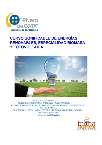 Os recordamos que tenemos previsto la realización de un curso sobre ENERGÍAS RENOVABLES, ESPECIALIDAD BIOMASA Y FOTOVOLTAICA, con una duración total de 20 horas. Se hará en fines de semana.