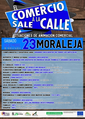 El próximo día 23 de Diciembre, de 10 a 14 horas , EL COMERCIO VUELVE A SALIR A LA CALLE, EN MORALEJA.( C/ Hernán Cortés; Plaza de la Resurrección; Pizarro; Primo de Rivera;Conde; Avenida Constitución, 1; Plaza de España, 13)Grandes descuentos y Actuaciones de Animación Comercial te esperan. No te lo pierdas!!