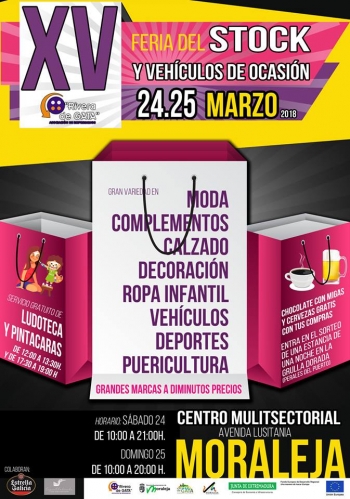 XV FERIA DE STOCKS Y VEHÍCULOS DE OCASIÓN. DÍAS 24 Y 25 DE MARZO. VEN Y DISFRUTA DE UNA GRAN VARIEDAD DE ARTÍCULOS, A PRECIOS MUY BAJOS. Y ADEMÁS , LOS MÁS PEQUEÑOS PODRÁN DISFRUTAR DE SERVICIO DE LUDOTECA GRATIS ( DE 12.00 A 13.30 y de 17:30 a 19:00, con pintacaras, juegos, etc) .CHOCOLATE CON MIGAS, CERVEZAS 2X1 Y SORTEO DE UNA ESTANCIA , GRATIS CON TUS COMPRAS.NO TE LA PIERDAS!!