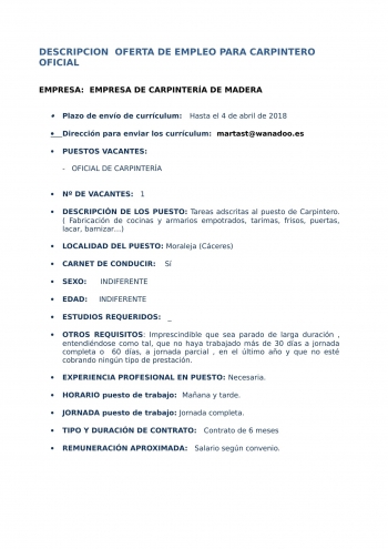 OFERTA DE EMPLEO PARA CARPINTERÍA DE MADERA DE MORALEJA.-SE NECESITA OFICIAL DE CARPINTERÍA