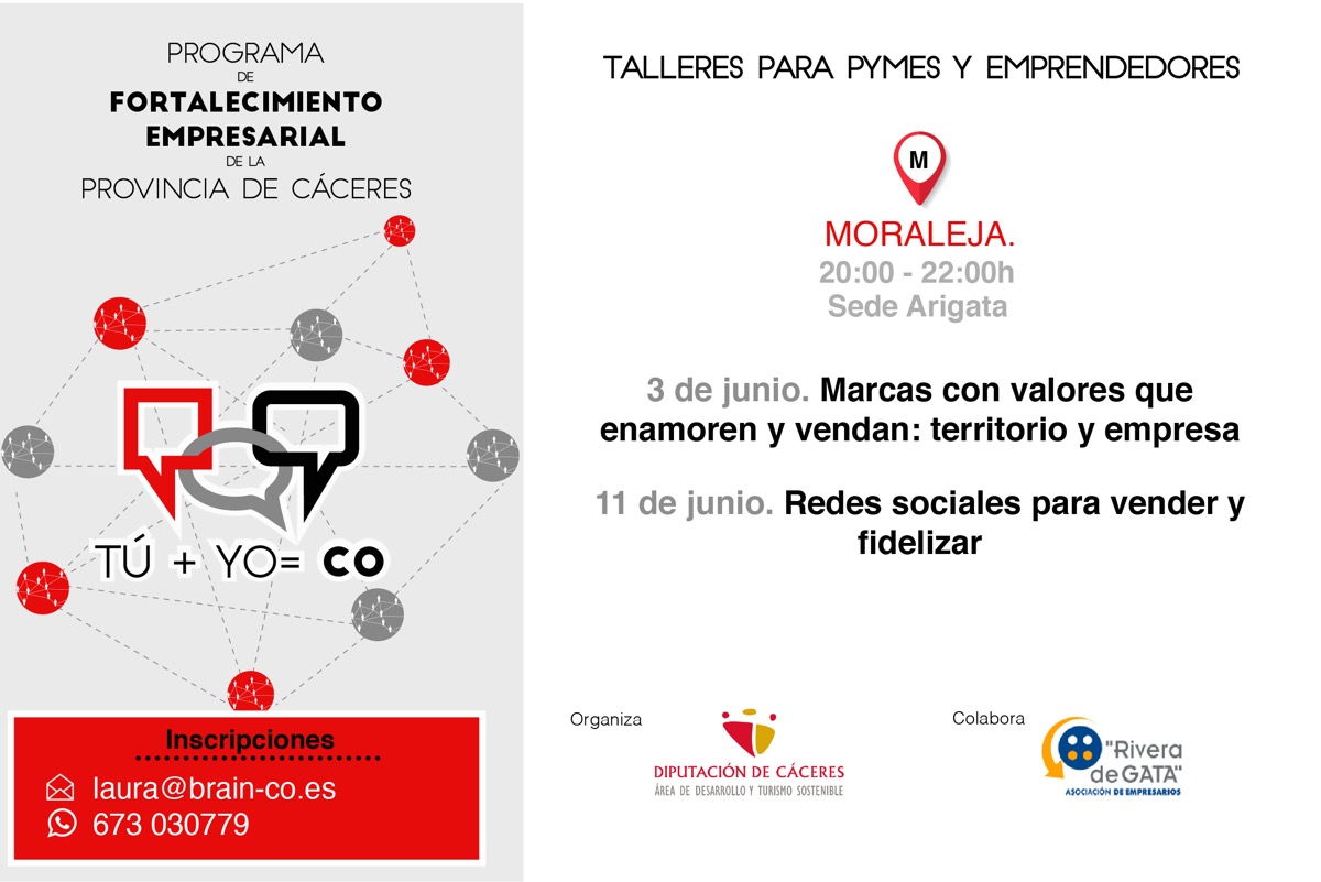 Dentro del programa de Fortalecimiento empresarial que la Excma Diputación de Cáceres está poniendo en marcha en la provincia, se tiene previsto celebrar en la sede de la Asociación de Empresarios Rivera de Gata, en Moraleja, los siguientes Talleres formativos gratuitos: