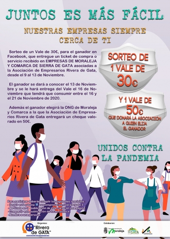 💕❤❤❤SORTEO "JUNTOS ES MÁS FÁCIL"❤❤❤NUESTRAS EMPRESAS SIEMPRE CERCA DE TI La Asociación de Empresarios Rivera de Gata, de Moraleja y Comarca de Sierra de Gata ,SORTEA UN VALE DE 30€, para ser consumidos en establecimientos asociados entre el 16 y el 21 de noviembre de 2020 y además, la persona ganadora nos indicará una ONG de Moraleja y Comarca a la que entregaremos un VALE DE 50€.Tan sólo debes cumplir los siguientes requisitos:❌Me Gusta en esta página de la Asociación de Empresarios Rivera de Gata si aún no la sigues ❌ Me Gusta en esta publicación, de forma pública❌Nombra a una persona indicando #apuestaporelconsumolocal❌Comparte esta publicaciónNombraremos al ganador el próximo 13 de Noviembre .Cuando retires el VALE, el ganador/a deberá presentar un ticket o factura de una compra o servicio recibido desde el día 9 al 13 de noviembre de 2020 .Las bases están expuestas en la web de la Asociación de Empresarios Rivera de Gata ( www.arigata.es) .NO OLVIDES NOMBRAR A UNA PERSONA, INDICANDO #APUESTAPORELCONSUMOLOCAL Y COMPARTIR ESTA PUBLICACIÓNSUERTE A TOD@S!!! LAS EMPRESAS DE MORALEJA Y SIERRA DE GATA SIEMPRE CERCA DE TI!!🍀🍀🍀