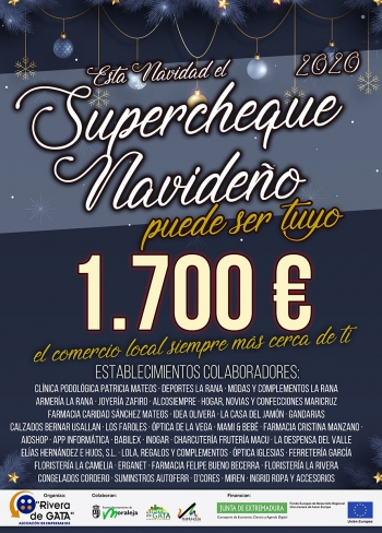El premio consistirá en un SUPERCHEQUE DE NAVIDAD , valorado en un importe de 1700€, CONSISTENTE EN 34 VALES POR IMPORTE DE 50€, CADA UNO, PARA SER CONSUMIDO EN CADA UNO DE LOS ESTABLECIMIENTOS PARTICIPANTES. Se entregará un sobre con los 34 vales al ganador, para que los vaya consumiendo en los diferentes establecimientos. El límite para consumir los vales en los establecimientos participantes se fija hasta Semana Santa, pasado este período quedarán sin efecto. Dentro de este período máximo, puede haber empresas participantes que establezcan un período menor para ser consumido e incluso algunas empresas , podrán indicar si se puede gastar en todos los productos o sólo en algunos.