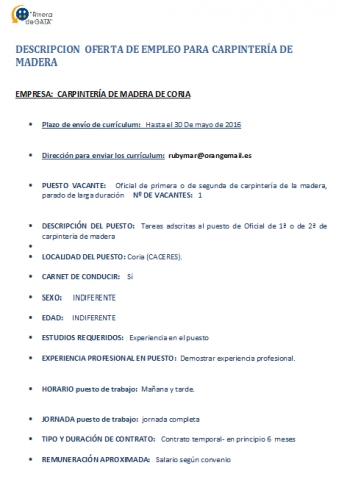OFERTA DE EMPLEO EN CARPINTERÍA DE LA MADERA DE CORIA , SEGÚN OFERTA PUBLICADA EN ARCHIVO ADJUNTO