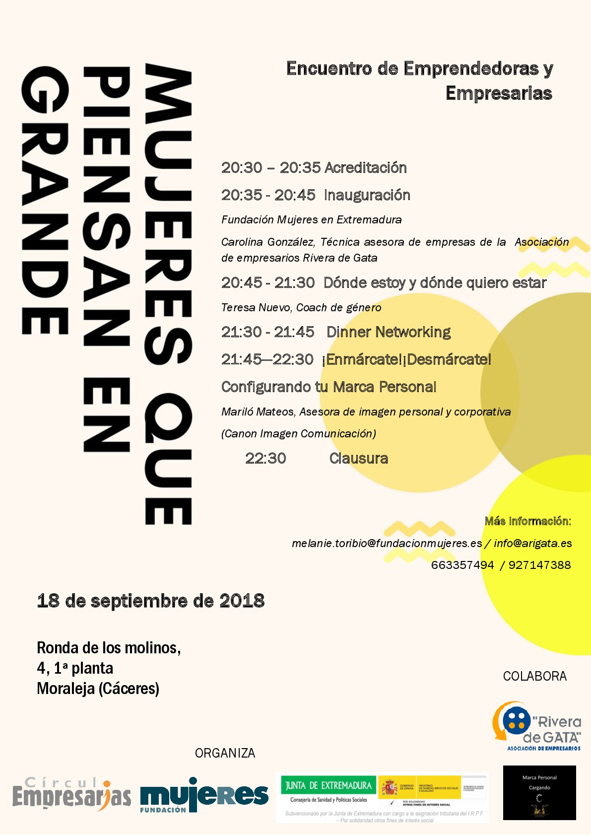 Desde Fundación Mujeres y la Asociación de empresarios “Rivera de Gata” te invitamos a participar en el próximo Encuentro Comarcal entre Emprendedoras y Empresarias que realizaremos el 18 de Septiembre, en C/Ronda de los Molinos, 4, 1ª planta (Moraleja).